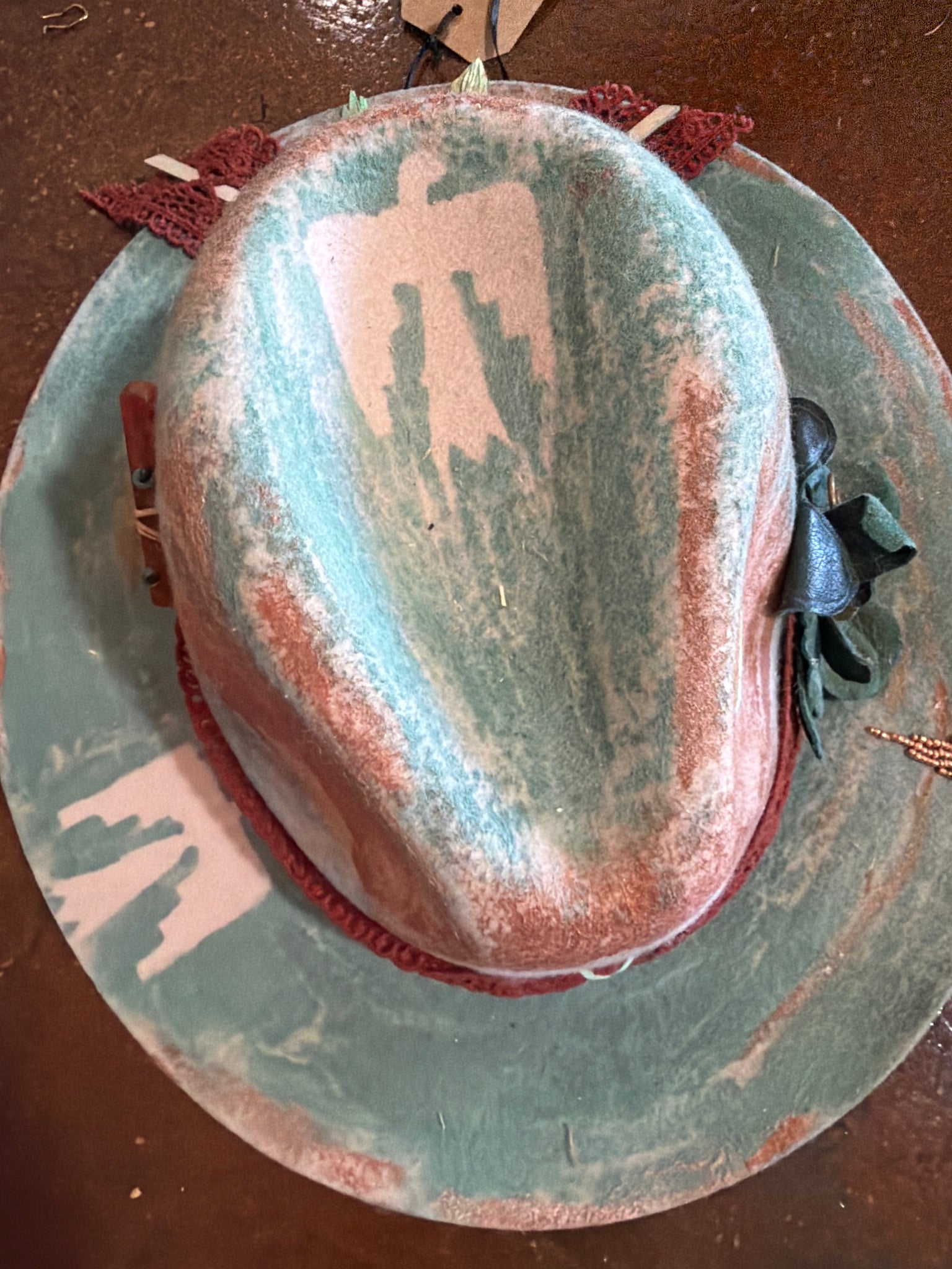 The hat is crafted with a range of unique designs, incorporating burning techniques, acrylic inks and paints, beads, hand sewing, leather patches and feathers.