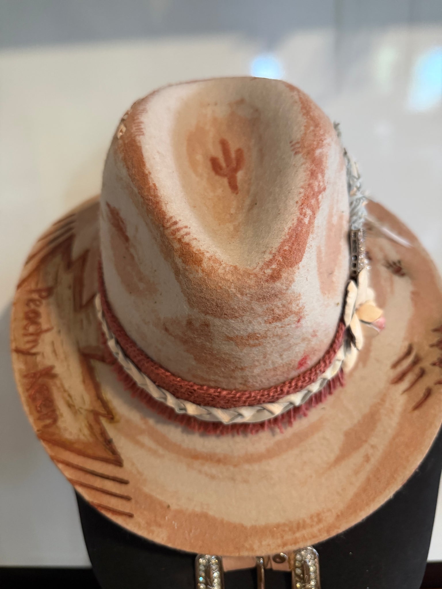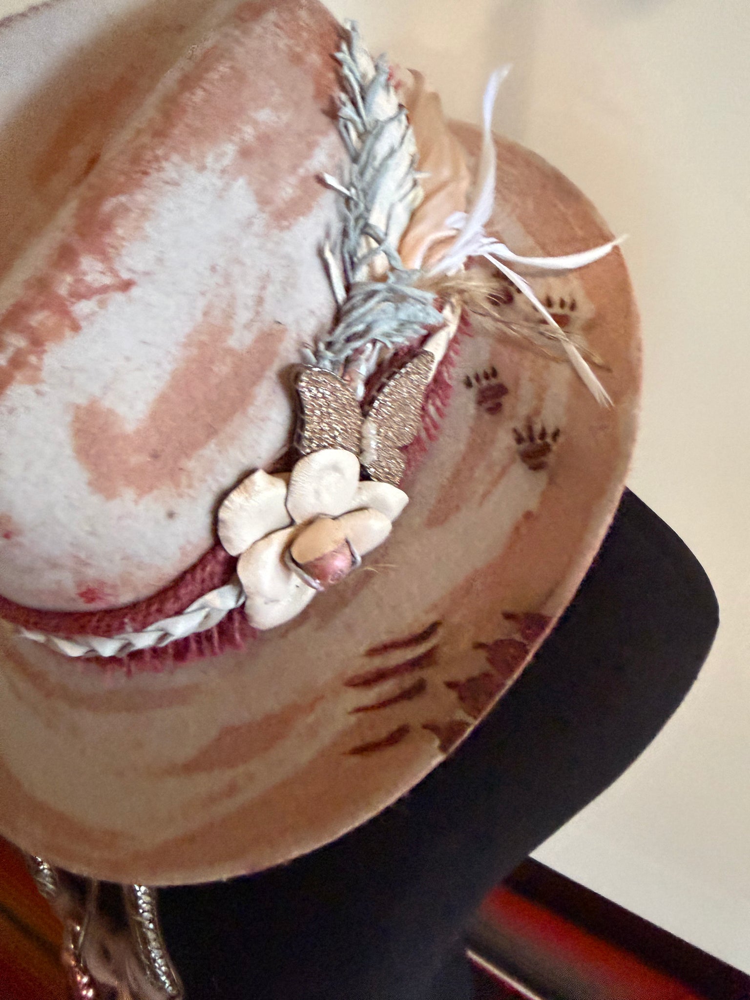 The hat is crafted with a range of unique designs, incorporating burning techniques, acrylic inks and paints, beads, hand sewing, leather patches and feathers.
