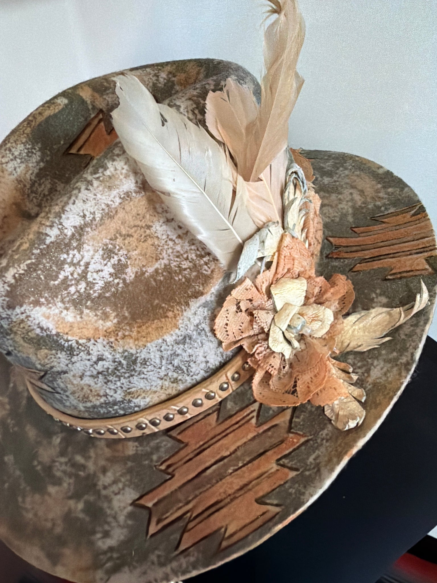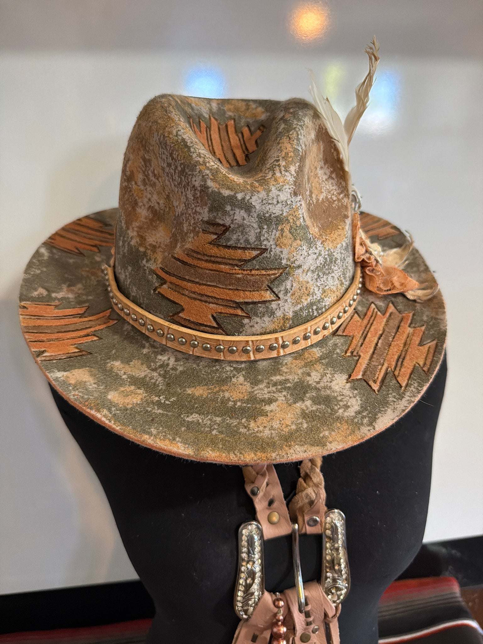 The hat is crafted with a range of unique designs, incorporating burning techniques, acrylic inks and paints, beads, hand sewing, leather patches and feathers.